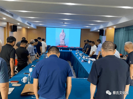▲全体起立脱帽,面向主席台中华蔡氏始祖叔度公像默哀,以示后裔们对先祖的缅怀和悼念。